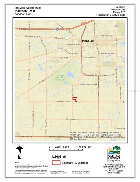 Under contract-accepting backup offers. Property has triple road frontage - 600 feet on Mud Lake Road, 450 feet on Trapnell Road, and 750 feet on Par Meadows Road. Property was planted pine which was harvested and replanted into pine in 2022. The eastern boundary abuts Plant City limits. Property is 3.5 miles south of downtown Plant City and is in an area of rapid growth. Property is high and dry.
