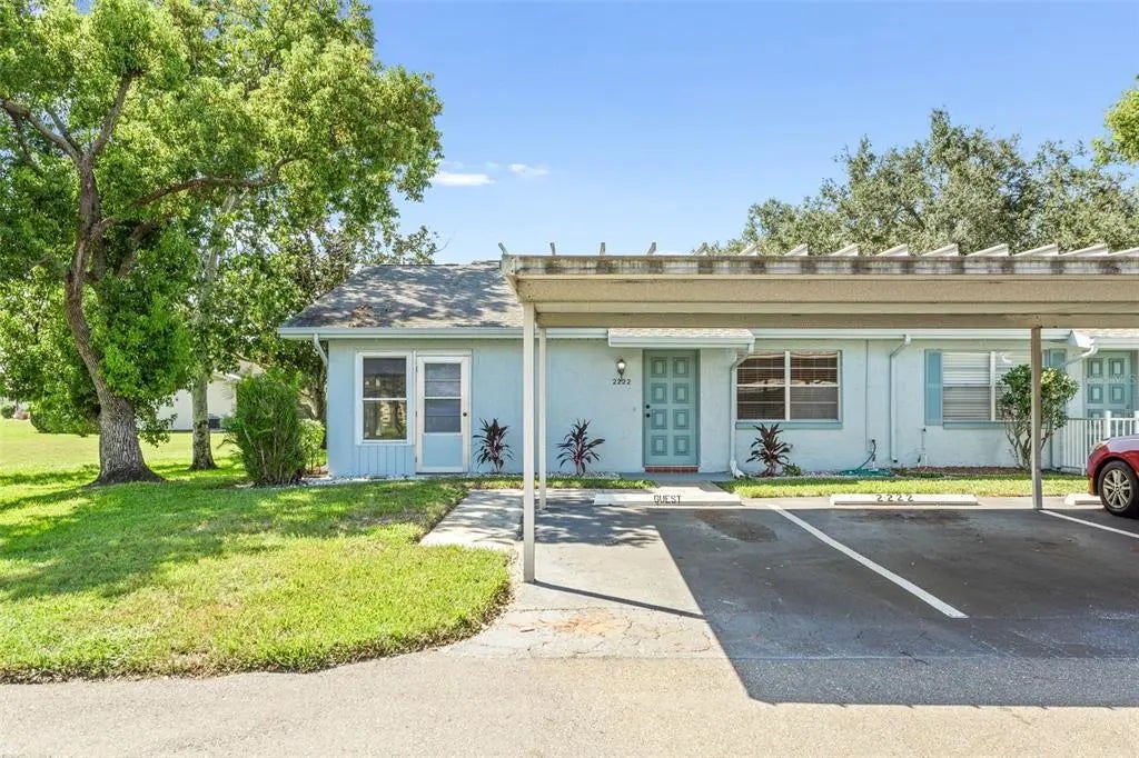 One or more photo(s) has been virtually staged. OWNER FINANCING available! Enjoy easy living in this charming 2-bedroom, 2-bath end unit condo located in the highly desirable Kings Point gated community, a resort-style haven for active adults! This home has loads of natural light and is freshly painted with new carpet. Primary bedroom boasts a walk in closet and an ensuite bath with shower. One of the home's highlights is the inviting 17' x 7' Florida room, featuring double-pane windows that bathe the room in morning sunshine while offering peaceful views of the shady backyard. It’s a perfect spot for relaxing with a cup of coffee. You'll also appreciate the convenient utility room, complete with space for a washer, dryer and extra storage. Utility room also includes double doors so you can park your golf cart inside! With 2 covered parking spaces right by the front door, getting in and out is a breeze. Kings Point is a golf cart-friendly community, allowing you to use your golf cart 24/7. Residents enjoy an impressive array of amenities, including two gorgeous clubhouses, six heated pools, a luxurious spa, fitness center, pickleball and tennis courts, plus dozens of clubs and activities to suit every interest and hobby. With easy access to I-75, you'll be close to local beaches, shopping, dining, churches, hospitals, and Tampa Bay’s sports and entertainment venues. This is the perfect place to embrace a relaxed yet active lifestyle—come see it today!