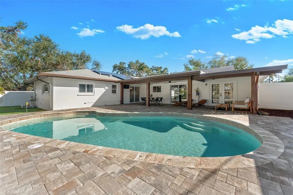 Under contract-accepting backup offers. This water front pool home exudes luxury at every turn. Less than 2mi to famous gulf beaches! With over 2000 square feet of home there is plenty of space for you and your family or guests. The home has a 2025 permitted full remodel. Make this your forever home or if you take advantage of its short term rental capability you could gross 180k annually (there are no rental restrictions). Fresh tiles throughout the entire home for a durable yet updated design. Unused stainless steel appliances, the stone backsplash quietly absorbing the under-cabinet lighting and the marbled quartz countertops waterfalling over the brand new oak shaker cabinets are statement pieces to this home. Just off the kitchen is a dining space with a large dry bar including stone counters, custom wood shelving and a wine fridge. The primary bedroom is a dream. This room has its own private walk in closet/bathroom combo with a free standing tub and an open rain shower. Each mirror, sconce and gold fixture is chosen to accentuate a modern sophistication design and its timeless Mediterranean charm. The primary bedroom includes French double doors that lead out to the brand new refinished salt water pool and pavers resting privately on a lake. The rich tones of the travertine and dark pavers accent the privacy walls and custom floating deck/pergola overlooking the lake. Don't feel like waiting in line at mini golf? There's a brand new, three hole, golf putting green tucked to the side great for family time. The other side of the home presents three more bedrooms and another full bath. Each bed room is large and 3 of the bed rooms have huge walk in closets. Large panoramic windows and sliders add natural light and breathtaking lakefront views. The inside as well as the outside have an open concept great for entertaining guests if you decide you have to keep it for yourself! PAID OFF SOLAR PANELS (2022). NOT IN A FLOOD ZONE. 2025 WINDOWS/newer HVAC. Photos do no justice! Come see this house in person for the true experience. option to buy fully furnished for a true turn-key AirBNB for maximum cashflow. Largo has no short term rental restrictions!