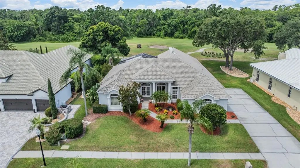 Under contract-accepting backup offers. A Rare Gem in the Prestigious Crescent Oaks Country Club! Tucked behind the gates of one of the area’s most sought-after guarded communities, this beautiful and hard-to-find pool home offers a perfect blend of luxury, space, and serene views. Featuring 4 spacious bedrooms, a private office/den, and an oversized Bonus room, this residence is ideal for both everyday living and grand entertaining. Set on a spectacular golf course and conservation homesite, the property showcases lush scenery from every angle. The heart of the home is a chef-inspired kitchen, complete with granite countertops, breakfast bar seating, custom maple cabinetry, a large pantry, and a convenient built-in desk. The Expansive family room is anchored by a striking double-sided fireplace with a floor-to-ceiling granite, adding warmth and sophistication. French doors lead you to the expansive bonus room, where you’ll find stepped ceilings, fireplace, access to the third full bath, and sliding glass doors that open directly to the screened private oasis. Elegant formal living and dining areas are adorned with crown molding, stepped ceilings, and sweeping views of the golf course. The primary suite is a true retreat, offering dual walk-in closets, and a luxurious en-suite bath with a jetted Jacuzzi tub, glass block step-in shower, Corian countertops, and maple cabinetry. Step out onto your Covered Screen Patio featuring Sparkling Pool & Spill over Spa with sweeping views of the Golf Course. Great location, you’re just minutes from the Pinellas Trail, top-rated schools, boutique shopping, and fantastic local dining. Spend weekends exploring the charming Tarpon Springs Sponge Docks, catching sunsets at Fred Howard Park or Sunset Beach, or enjoying quick access to Honeymoon Island and Clearwater Beach. Whether you're enjoying the peacefulness of your backyard, taking a dip in the pool, or entertaining guests in your bonus room, 394 Tall Oak Trail offers the ultimate Florida lifestyle all within a premier golf course community. Family Room Chandelier, Family & Living Room Drapes DO NOT CONVEY.