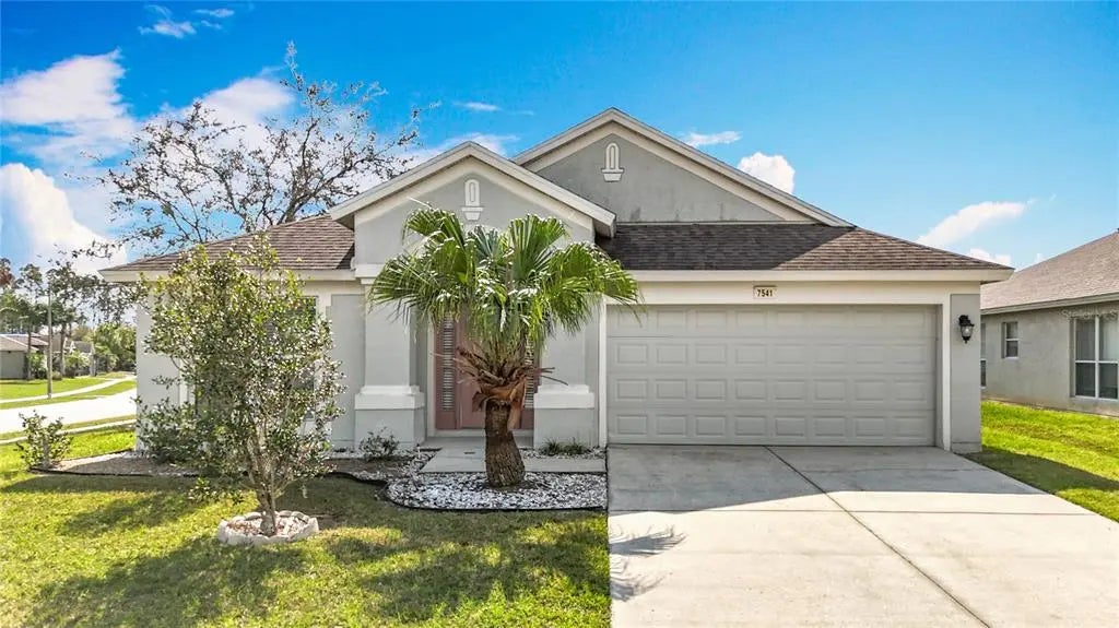 Located in Palm Cove on a corner lot, this 4 bedroom 2 bath home features a great room for the living room and combined dining room. kitchen with granite counter tops, plenty of cabinets and tile floor and open to the family room which overlooks the screened patio. Primary bedroom has large walk in closet and french doors open to the bath with split vanities, separate tub and shower. All bedrooms have new carpet. Screened patio for added space. NO CDD and low HOA payments. freshly painted garage floor. Community offers pool, dog park and more
