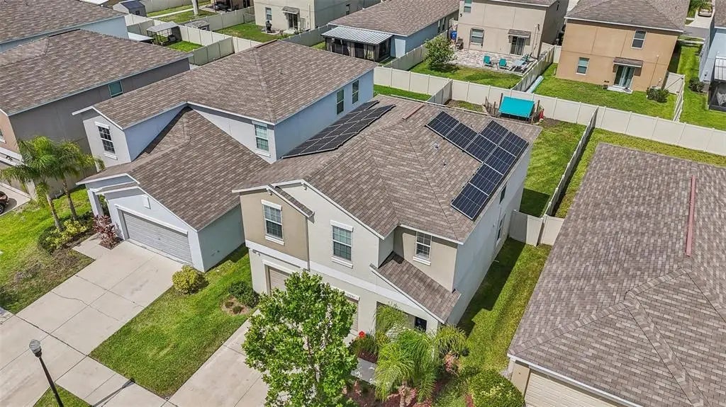 GREEN LIVING, LOW MAINTENANCE & HIGH-END STYLE IN VISTA PALMS! Enjoy essentially free electricity for life in this beautifully upgraded 4-bedroom, 2.5-bath home with fully paid-off solar panels (9.72kW). Monthly electric bills are typically just the minimum TECO charge of $13, and the system sells an average of 800kWh back to the grid—a rare find that combines luxury and long-term savings. Built in 2018, this energy-smart home also features spray foam attic insulation, reducing energy usage and boosting comfort year-round. Inside, you’ll find an open-concept layout with designer upgrades, including a gourmet kitchen with stainless steel appliances, farmhouse sink, large island, and upgraded tile flooring. Upstairs offers a versatile loft, spacious primary suite, and convenient laundry. The fully fenced backyard is perfect for relaxing or entertaining, and the SimpliSafe smart security system adds peace of mind. Located in amenity-rich Vista Palms with lawn care included, pools, trails, and courts—and just minutes from I-75 and Gulf Coast beaches. Green, gorgeous, and move-in ready. Sellers are motivated—don’t miss this one!