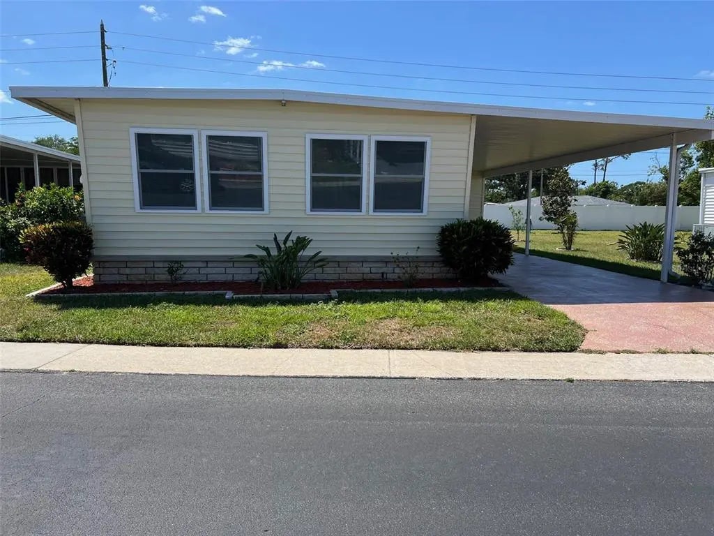 The exterior of this home is eye-catching, with its light-colored vinyl siding giving it a clean, modern appeal. A recently updated two-car carport pairs perfectly with a designer driveway, adding both style and functionality. Storm shutters provide extra peace of mind during stormy weather. The extra-large extended shed not only includes a washer and dryer but also offers ample space for storing yard tools and more, adding to the home's overall accessibility. Thoughtful landscaping enhances the curb appeal, while the roof-over adds durability and long-term value. Priced at just $114,900 with a share included, this property is a fantastic find. Don’t let this opportunity slip away—call today to schedule your showing!