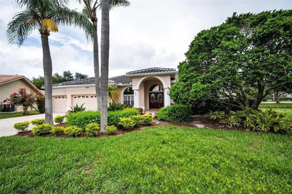 Under contract-accepting backup offers. PRICE REDUCED! Motivated seller! Welcome to Westwind at Ridgemoor – A Prestigious Gated Retreat Tucked away on a serene cul-de-sac, this beautifully maintained residence offers breathtaking pond and private pool/spa views from nearly every room. Located in the coveted, gated enclave of Westwind, this 4-bedroom, 3-bathroom home with a spacious office/den and 3-car garage embraces Florida elegance and comfort. The thoughtfully designed triple split floorplan provides space and privacy, including a luxurious owner’s suite with sliders to the lanai, a large walk-in closet, garden tub, separate shower, and dual vanities. The light-filled kitchen features granite countertops, rich wood cabinetry, stainless steel appliances, and a long breakfast bar—perfect for gatherings. Relax in the expansive family room, where triple sliding glass doors frame stunning water views and a cozy gas fireplace adds charm. Step outside to your covered lanai and enjoy seamless indoor-outdoor entertaining. A private back bedroom with an en suite pool bath makes an ideal in-law suite or teen haven, while two additional bedrooms share a private wing and full bath. With a new A/C system (2025), a durable tile roof (2014), and proximity to world-renowned beaches, golf, dining, and top-rated schools, this home will sell fast!