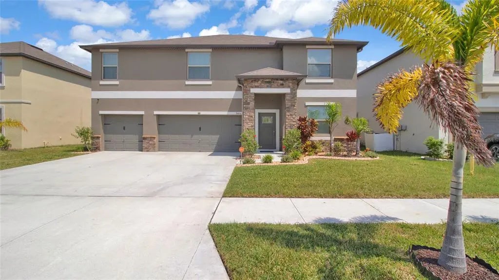 Unique and the only House with this floorplan on this Community - Welcome to this spacious 6-bedroom with a Den and a Gym room and 4 Full Bathrooms, a 2-story home with 3-car garages located in the Belmont community. Just off Apollo Beach Exit. Designed with an open-concept layout, the kitchen seamlessly overlooks the living and dining areas, as well as the outdoor open patio, perfect for relaxing or entertaining with a 17x40 covered-screened Lanai, with a stunning pond view and a Heated Swim Spa. All fenced in. The kitchen is a chef's dream, featuring an oversized island, pantry, all-wood cabinetry, quartz countertops, and a full suite of stainless-steel appliances including a gas range, microwave, dishwasher, and side-by-side refrigerator. Reverse Osmosis included. 1 bedrooms on the 1st floor for guests and a Full bathroom. The other 5 bedrooms are on the 2nd floor. The large primary bedroom is overlooking the pond with 2 walk-in closets, separate sinks, cabinets for his and hers, a shower, and a separate garden tub. The other 4 bedrooms are a nice size with 2 additional full bathrooms, both with Double sinks. Additional highlights include a laundry room with a full-size washer and dryer, a loft area, and a Gym Room. The 3-car garage has an Electric Vehicle charger. Enjoy all that the Belmont community has to offer, including a resort-style pool, clubhouse, playgrounds, dog park, and peaceful walking trails. Conveniently located near top-rated schools, hospitals, shopping, dining, and with easy access to the interstate for commuting.. Don't miss this opportunity to live in comfort and style. Schedule your showing today!