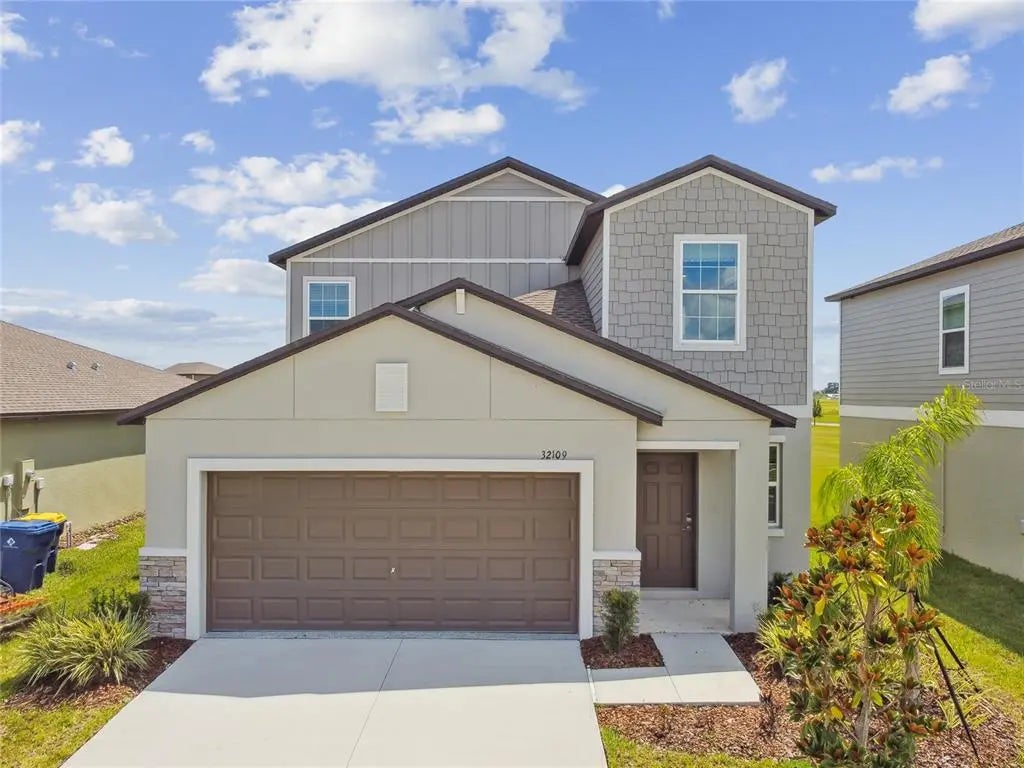 BUILDER MODEL FOR SALE-NEVER LIVED IN-This 2023-built Columbia floor plan offers 5 bedrooms, 2.5 baths, with the PRIMARY SUITE LOCATED ON FIRST FLOOR and four additional bedrooms PLUS LOFT upstairs. Located in the golf cart-friendly, resort-style community of Mirada—home to the nation's largest Metro Lagoon—this former builder model includes upgraded designer finishes, custom accent walls, and decorative touches throughout. Tile flooring spans the main living areas; bedrooms and second floor are carpeted. The open kitchen features a large center island with sink, QUARTZ COUNTERTOPS, walk-in pantry, and modern cabinetry. The primary suite offers a large walk-in closet, dual sink vanity, and walk-in shower. Sliding glass doors open to the backyard for seamless indoor-outdoor living. Built in 2022 with newer roof, HVAC, and water heater for peace of mind. HOA FEE INCLUDES CABLE AND HIGH-SPEED INTERNET. Enjoy Mirada’s crystal-clear Metro Lagoon, walking trails, green spaces, community events, and easy access to I-75, shopping, dining, and entertainment.