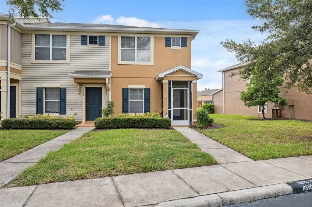 Welcome Home to Panther Trace Living! Step into this beautifully maintained end-unit townhome nestled in the desirable Panther Trace community, offering both comfort and style. Enjoy serene pond views from your expansive tiled and screened lanai, perfect for relaxing or entertaining outdoors. This spacious 2-bedroom, 2 full and 2 half-bath home features numerous upgrades, including brand new interior and exterior paint, stylish accent walls in the living area and primary bedroom, and new flooring throughout. The kitchen is generously sized with stainless steel appliances, recessed lighting, a walk-in pantry, and additional storage under the stairs. The upstairs layout offers privacy and comfort, with two large bedrooms, each with their own ensuite bathroom. The primary suite features his and her closets and overlooks peaceful pond views. Other recent upgrades include a 2020 roof and a 16 SEER AC system (installed in 2019) equipped with UV lights in the ducts and coils for enhanced air quality. Located just minutes from shopping, dining, and entertainment, this home combines convenience with modern living in a well-kept community. Don’t miss your chance to make this one yours!