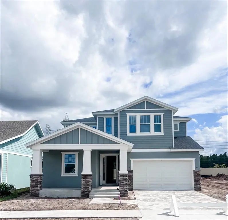 Under Construction. Spacious 2-Story Home with 2-Car Garage, Gourmet Kitchen & Flexible 4-Bedroom Layout Welcome to this beautifully designed Bromeliad plan, featuring a charming Craftsman-style exterior and a thoughtfully planned interior layout perfect for modern living. With up to 4 bedrooms and 3 full bathrooms, this spacious two-story home offers both comfort and functionality. Step onto the covered front porch and into a grand foyer, where you'll find a first-floor bedroom and full bath—ideal for guests or a home office. The open-concept main living area includes a gourmet kitchen with a large prep island, walk-in pantry, and seamless flow into the dining area and expansive family room—perfect for entertaining or relaxing. Enjoy outdoor living on the covered lanai, finished with elegant brick pavers that match the driveway for a cohesive look. Upstairs, the primary suite is a true retreat, featuring a spa-inspired en suite bathroom with dual vanities, a step-in shower, and a walk-in closet. Two additional bedrooms—one with a walk-in closet—a full bath, and a conveniently located upstairs laundry room complete the second floor. Don’t miss your opportunity to own this beautifully designed home with flexible living spaces and timeless style.