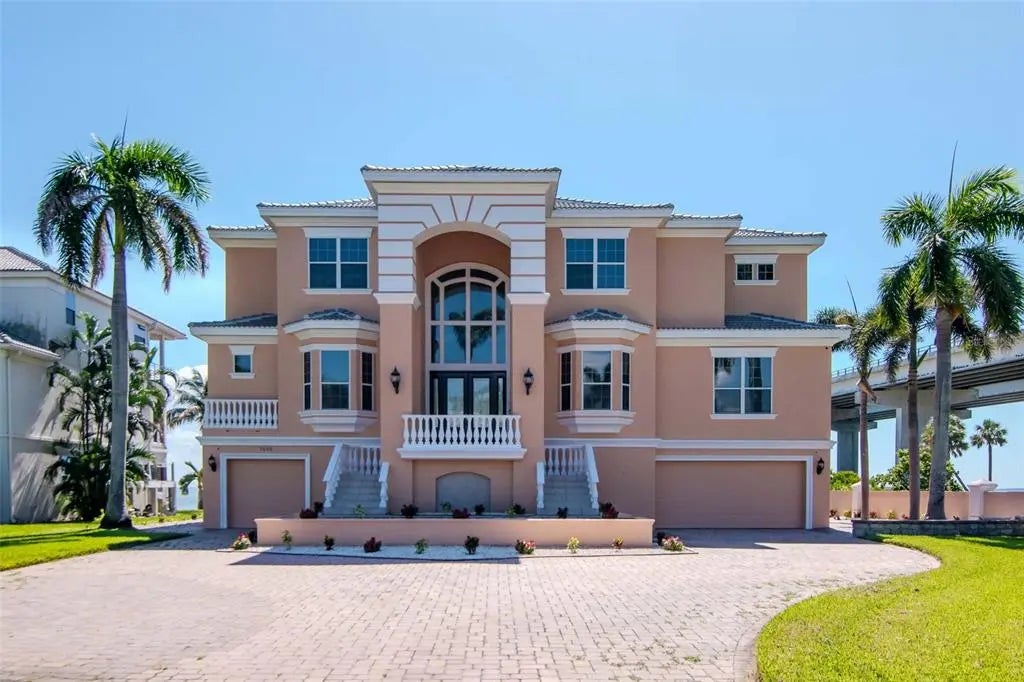 One or more photo(s) has been virtually staged. Experience the best of waterfront living in this beautifully appointed 5-bedroom, 6-bath residence offering 4,168 square feet of thoughtfully designed space. Built in 2000, this elegant home is perfectly positioned to showcase sweeping views of Tampa Bay and the iconic Sunshine Skyway Bridge. Ideal for the car enthusiast, the entire first level serves as an expansive garage that can easily accommodate a sizable collection. With two full bathrooms for poolside convenience and a generous flex space currently used as a bar, the lower level offers versatility for entertaining or additional storage. Upon entering the foyer, you are greeted by a dramatic two-story living room where oversized windows bathe the space in natural light and frame unobstructed views of the bay. The open, split-floorplan centers around the primary suite, a serene retreat featuring dual walk-in closets, a spacious bath with soaking tub and walk-in shower, and private access—via a spiral staircase—to the dedicated upstairs office or study. Designed for entertaining, the expansive kitchen offers abundant counter space for meal prep, a breakfast nook overlooking the water, and seamless flow to the living and dining areas. Guests will appreciate the convenience of a downstairs bedroom located near an adjacent full bath—perfect for comfort and accessibility. The third floor hosts three additional bedrooms, including one ensuite and two connected by a Jack-and-Jill bath. The office/study and rear bedroom each open to their own terraces, providing idyllic spaces to enjoy daily sunrises, sunsets, and the tranquil beauty of the bay. Located within an exclusive gated cul-de-sac of just seven luxury homes, this property offers privacy, security, and an elevated sense of retreat. Boating enthusiasts will love the private dock equipped with a lift and jet ski floating dock—perfect for effortless days on the water and prime fishing for the sportsman. A rare opportunity to own a waterfront sanctuary that seamlessly blends luxury, comfort, and the unmatched allure of Tampa Bay living.