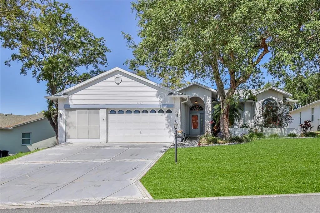 Under contract-accepting backup offers. Welcome to your dream home in Timber Pines, a premier 55+ gated country club community where every day feels like a vacation. Perfectly positioned on the 13th tee box of The Hills Golf Course, this 3-bedroom, 2-bath home invites you to experience the best of Florida living. Enjoy newer laminate flooring, a spacious inside laundry room, and an oversized 3-car garage with plenty of room for two vehicles and your golf cart. The heart of the home is a light and bright kitchen with vaulted ceilings, wood cabinets, wood countertops, stainless steel appliances, a skylight, and a built-in desk — perfect for casual mornings before heading out to play pickleball, golf on one of three gorgeous golf courses, or practice your swing on the 9-hole pitch and putt. Relax and entertain in the family room featuring an electric fireplace, wet bar, and built-in cabinetry. Three sets of triple sliding glass doors open to a large screened lanai and paved patio, offering stunning views of the golf course and a perfect place to watch the golfers tee off. The master suite is a private retreat with a large garden tub, separate shower with bench seating, and dual sinks. The second bedroom features a generous walk-in closet for extra storage. With a brand new roof in 2023, room for a pool, and endless amenities right at your fingertips — including golf, tennis, pickleball, fitness centers, dining, and more — this is your opportunity to live the vibrant, active Timber Pines lifestyle!